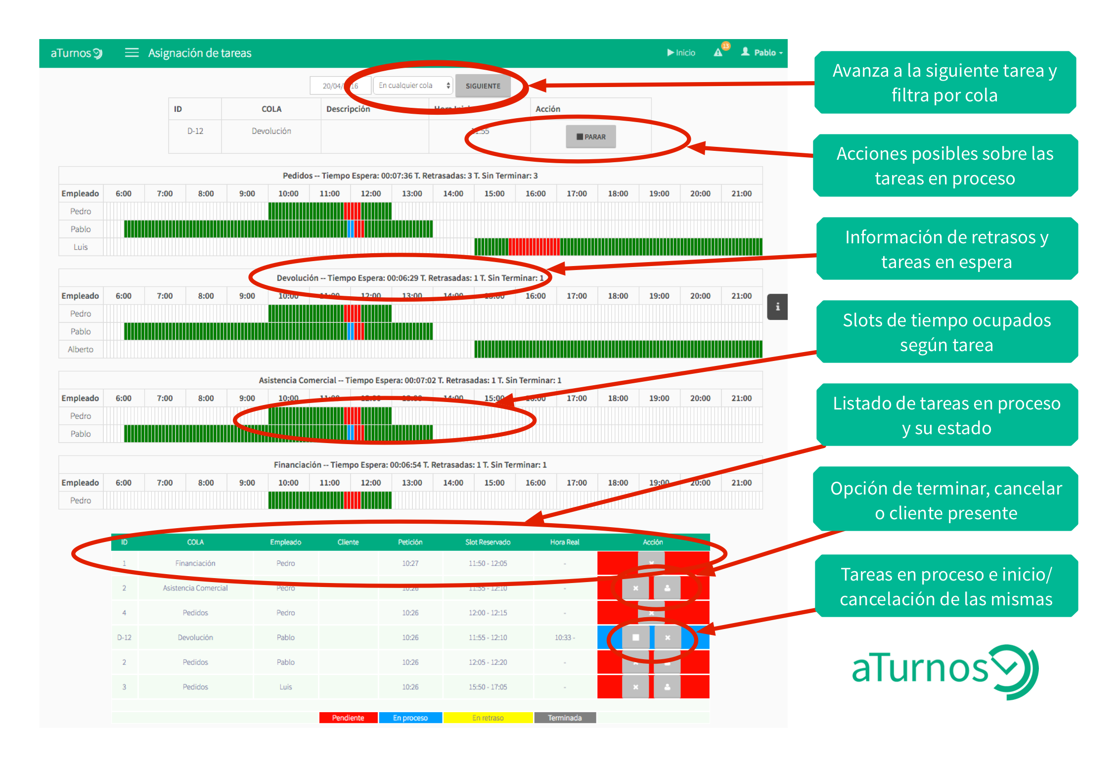 3. Ahora tenemos a nuestros compañeros al mando del sistema. En su visualización solicitan nuevas tareas, comprobar los retrasos en cada una de ellas, avisar que el cliente está en tienda o revisar la carga de trabajo actual y prevista. La función de asignación e inicio de nuevas tareas está diseñada para que el trabajador solo tenga que 'darle' al 'Siguiente' para comenzar a ejecutar la tarea asignada o en momentos determinados priorizar bajo criterios que puede ser definidos por el responsable de equipo.